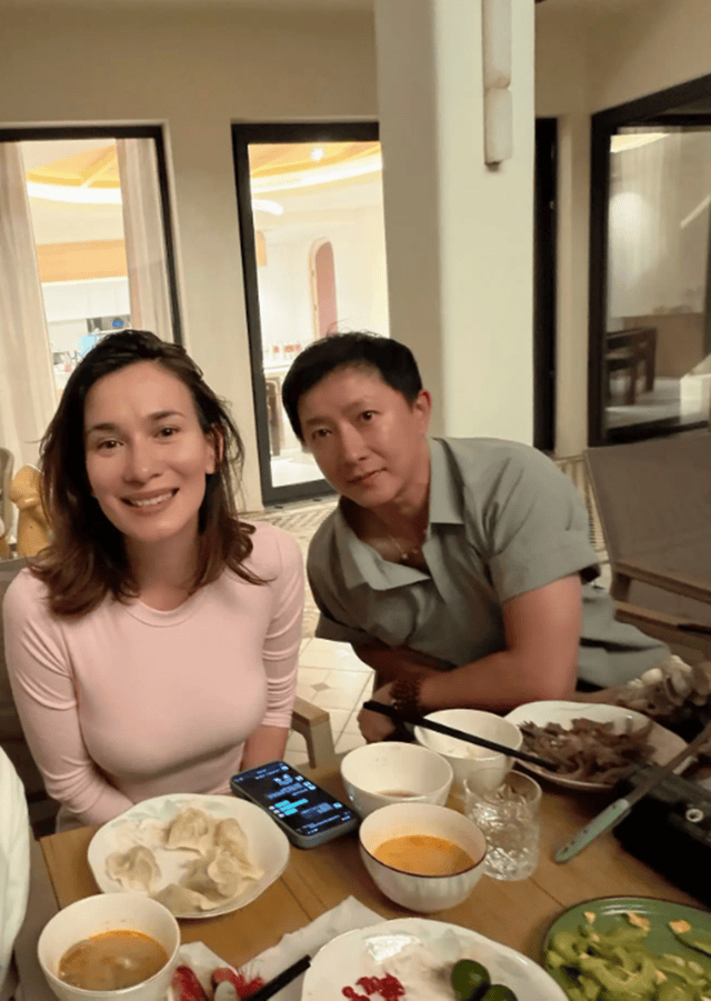 照片中,卢靖姗与老公韩庚正与友人围坐餐桌共享美食,氛围温馨自然。卢靖姗位于画面中央,身穿浅粉色紧身长袖上衣,凸显其匀称身形,她的中长发自然微卷,发丝柔顺有光泽。